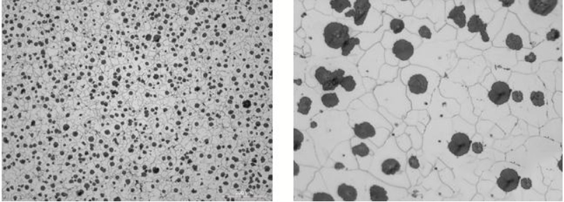 Na základě empirického pozorování je proto horní hranice uhlíkového ekvivalentu v tvárné litině dosaženo při pozorování plovoucího grafitu v roztaveném železe (při teplotě kolem 1200 °C). Vliv obsahu uhlíku na výkonnost tvárné litiny: Obsah uhlíku v odlitcích z tvárné litiny ovlivňuje množství grafitu vysráženého během tuhnutí, což se vztahuje k průměrné velikosti nebo počtu kuliček grafitu. Typicky obsah uhlíkuodlitky z tvárné litinyse pohybuje mezi 2 % a 3,9 %, ale je zásadní pochopit dopad snížení obsahu uhlíku na mechanické vlastnosti litiny. To by mělo být zváženo na základě struktury, rozměrů, tloušťky stěny a chyb v tloušťce stěny sousedních rovinných stěnodlitky z tvárné litiny. Snížení obsahu uhlíku v tvárné litině z asi 4 % na 2,5 % může mírně zvýšit pevnost v tahu a mez kluzu (kolem 23 až 31 N/mm²) a také zvýšit tažnost asi o 5 %, s výrazným zlepšením hodnot rázu.